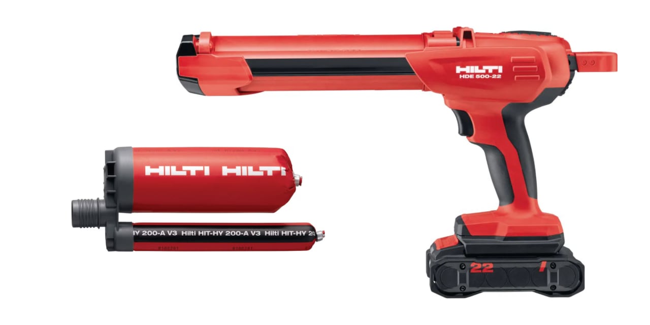 The HDE 500-22 cordless adhesive dispenser and Hilti epoxy and adhesive anchors help provide a clean and accurate solution for setting structural anchors in concrete foundations, columns, and beams, offering high load-bearing capacity and durability.